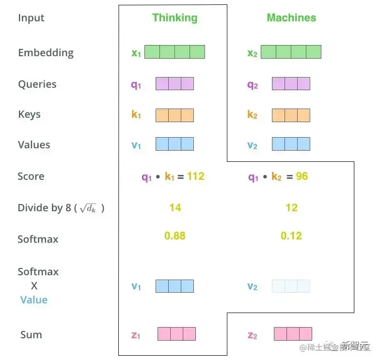 核心组件就是上面所提到的Self-Attention和Feed Forward Networks,但还有很多其他细节,接下来我们就开始逐个结构的来解读Transformer。Self AttentionSelf Attention就是句子中的某个词对于本身的所有词做一次Attention。算出每个词对于这个词的权重,然后将这个词表示为所有词的加权和。每一次的Self Attention操作,就像是为每个词做了一次Convolution操作或Aggregation操作。具体操作如下:首先,每个词都要通过三个矩阵Wq, Wk, Wv进行一次线性变化,一分为三,生成每个词自己的query, key, vector三个向量。以一个词为中心进行Self Attention时,都是用这个词的key向量与每个词的query向量做点积,再通过Softmax归一化出权重。然后通过这些权重算出所有词的vector的加权和,作为这个词的输出。具体过程如下图所示