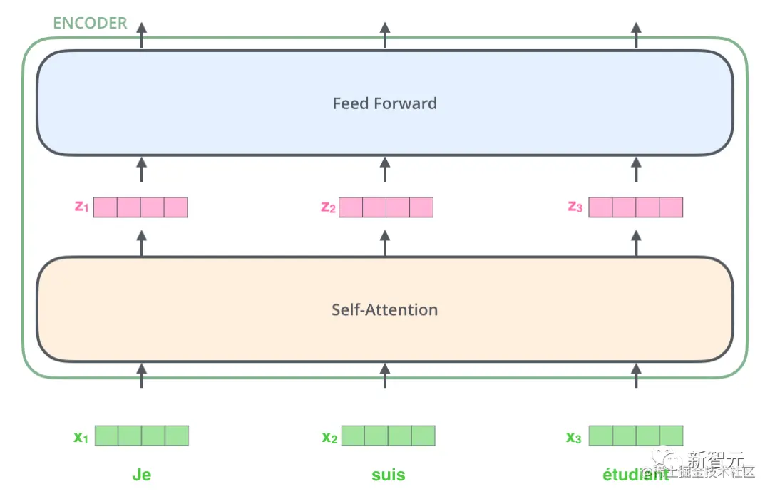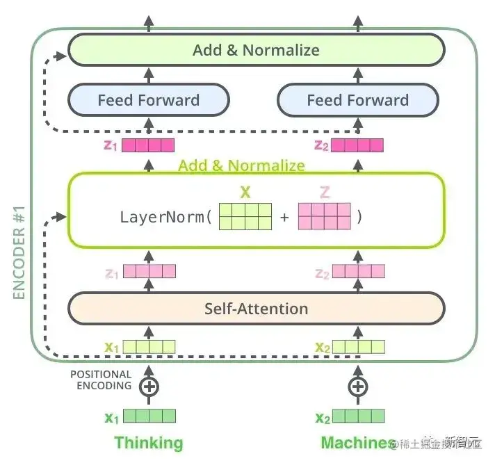 - 每个Encoder Transformer会进行一次Multi-head self attention->Add & Normalize->FFN->Add & Normalize流程,然后将输出输入至下一个Encoder中