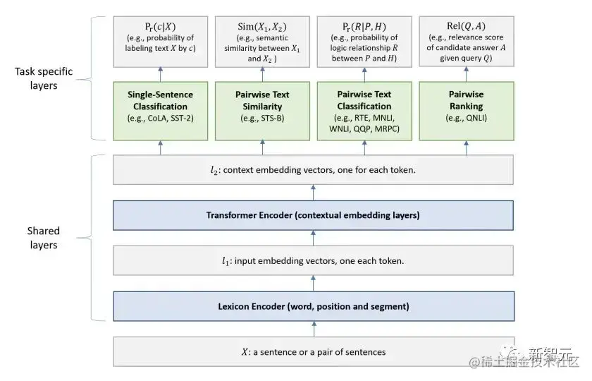 MT-DNN (Multi-Task Deep Neural Networks) 依然采用了BERT的二阶段训练方法以及双向Transformer。在Pre-Training阶段,MT-DNN与BERT几乎完全一样,但是在Fine-Tuning阶段,MT-DNN采用了多任务的微调方式。同时采用Transformer输出的上下文Embedding进行单句分类、文本对相似度、文本对分类以及问答等任务的训练。整个结构如下图所示: