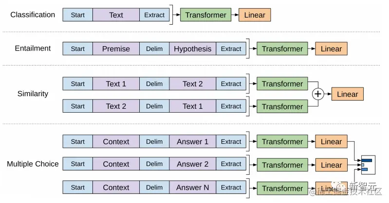 由于使用了Masked Self-Attention,所以每个位置的词都不会“看见”后面的词,也就是预测的时候是看不见“答案”的,保证了模型的合理性,这也是为什么OpenAI采用了单向Transformer的原因。Fine-Tuning与不同输入数据结构的变化接下来就进入模型训练的第二步,运用少量的带标签数据对模型参数进行微调。上一步中最后一个词的输出我们没有用到,在这一步中就要使用这一个输出来作为下游监督学习的输入。