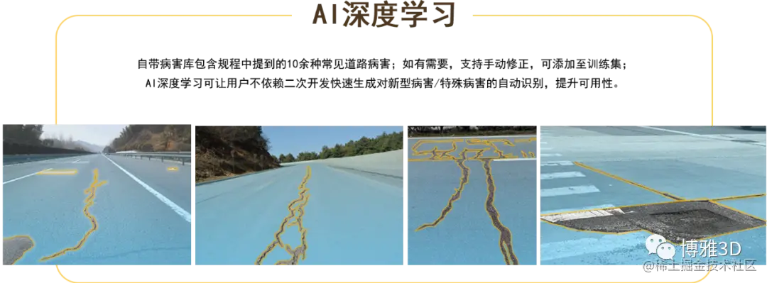 现在,【RGB3DS道路表观病害信息智慧检测系统】自带病害库涵盖行业标准中提及的10余种病害,可高效自动识别道路病害;同时搭载AI自我学习能力,可将手动添加的新型病害、特殊病害添加至训练集,让软件在不依靠二次开发的情况下,快速形成对新型病害/特殊病害的自动识别,高效响应需求,实现可用性的自我提升。