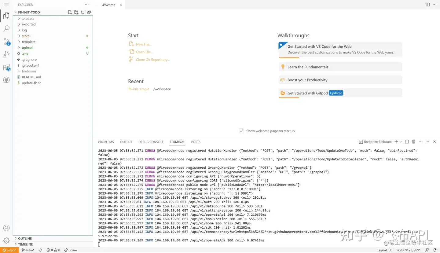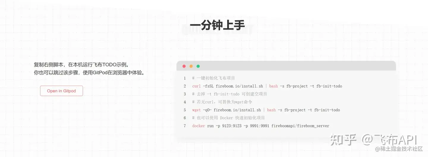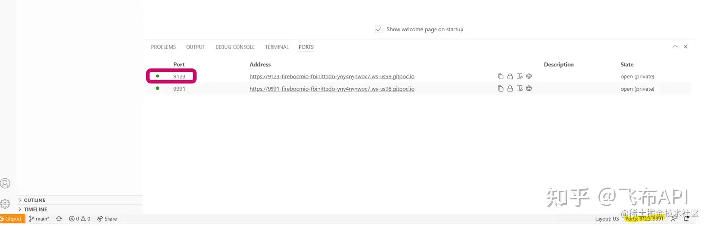 除了本地安装,你也可以直接在线体验飞布。打开飞布官网,找到“一分钟上手”处,点击 “open in gitpod" 按钮。第一次使用时,请使用github登录。稍等片刻,飞布示例项目就初始化成功了。在底部切换到PORTS页签,点击9123对应的链接,即可打开飞布控制台。