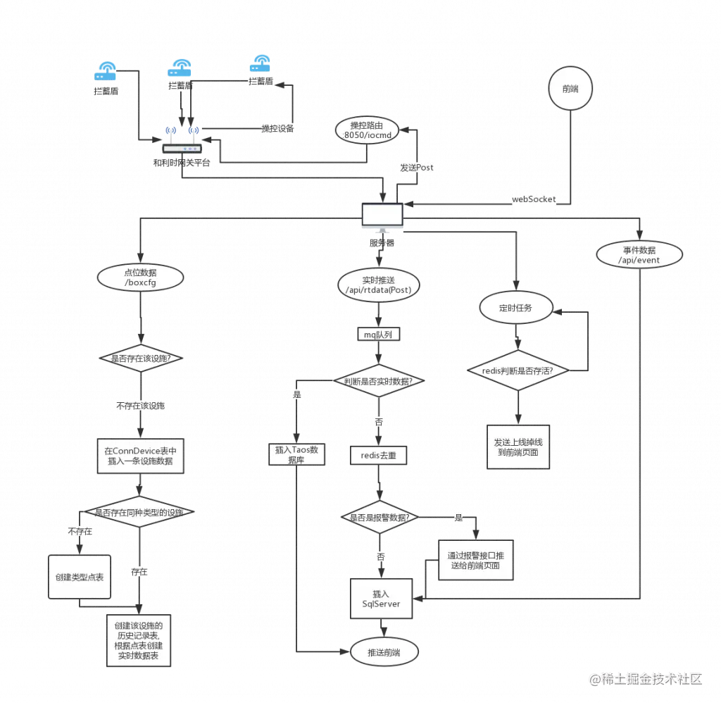 鼎蓝水务智慧排水系统需要处理来自拦蓄盾检测设备上报的数据。在这些监测数据的处理流程上,数据从网关推送过来后会有一个判断是否实时数据。此前所有数据都是使用 SQL Server 存储,数据量达到 2000 万后 SQL Server 的查询时延就变得非常慢,不得不做分库分表操作来提高查询速度,但这个解决方法遇到跨库跨表的查询非常不便。架构改造后,对于非实时数据,则会流经 Redis 去重,做报警判断然后写入 SQL Server;对于实时数据则直接写入TDengine,不需要再经过 Redis,之后前端需要的一些类似液位电流数据等就可以直接从 TDengine 访问。