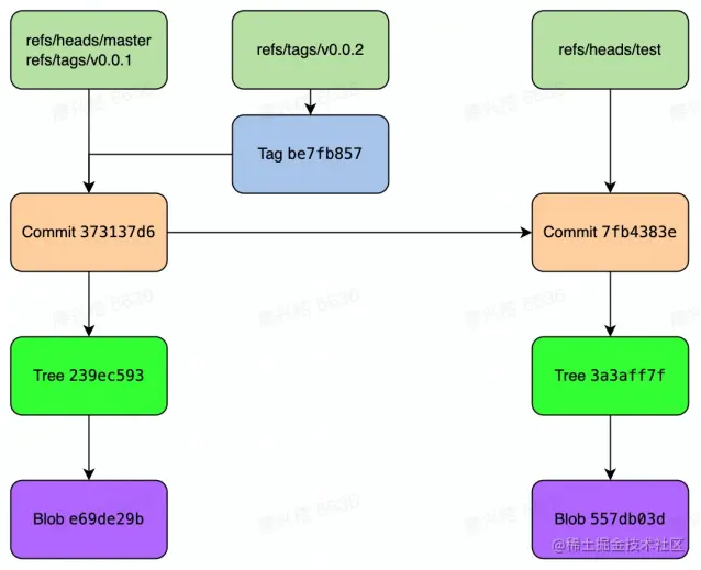 通过git commit --amend命令,尝试修改一下commit message,修改Commit后我们可以发现git object又出现了变化新增commit object 7f,但是之前的commit object 63并没有被删除。此时63就变成了悬空的object,顾名思义就是没有ref指向的object,