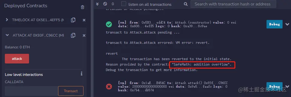 使用了安全运算库后,当我们去攻击TimeLock合约时,就会报错。如下图。