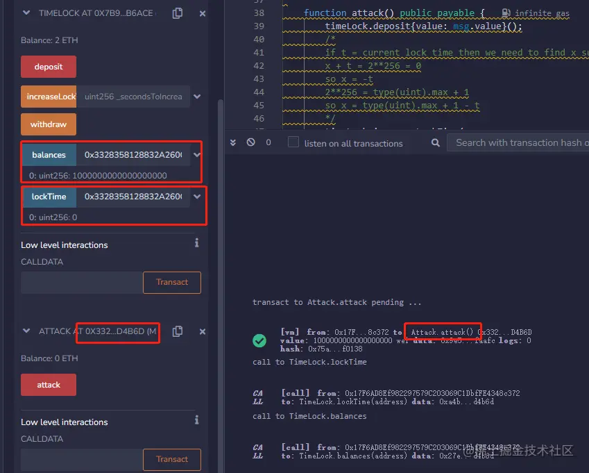 其次,我们编译部署Attack合约,用户B质押1个ether并触发attack方法,此时用户B根据attack方法的逻辑,将1个ether存入到了TimeLock合约,但是随即又可以从TimeLock合约中将质押的1个ether提取出来。从TimeLock合约查看Attack合约的余额可以发现为1个ether,证明已经提取出来了。再查看Attack合约的lockTime,此时已经变成了0,证明攻击成功。