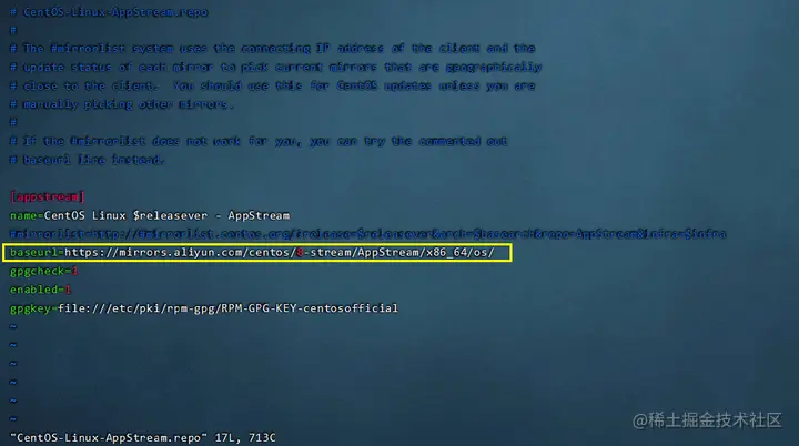 CentOS-Linux-AppStream.repo的baseurl修改为https://mirrors.aliyun.com/centos/8-stream/AppStream/x86_64/os/