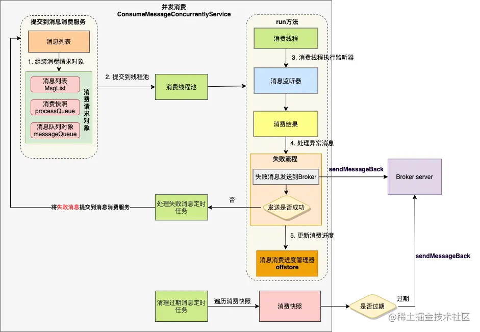 updateOffset,先更新到内存offsetTable,定时上报到 Broker ;若消费失败,则将失败消费发送到 Broker 。 - Broker 端接收到请求后, 调用消费进度管理器的