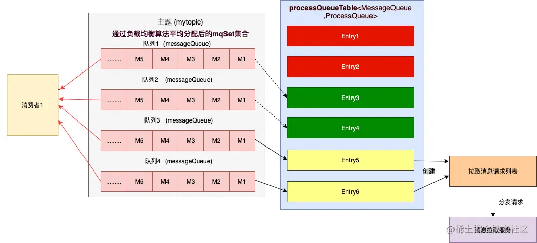 - 绿色的 Entry 部分表示与分配到的消息队列集合的交集,processQueueTable 对象中已经存在该队列。