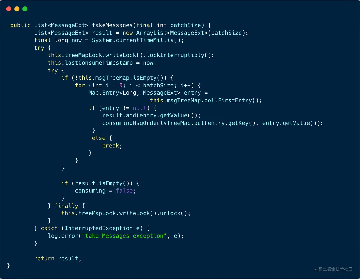 pullRequest, 拉取请求保存一个处理队列processQueue,内部是红黑树(TreeMap),用来保存拉取到的消息 ; - 拉取消息服务单线程从拉取请求队列