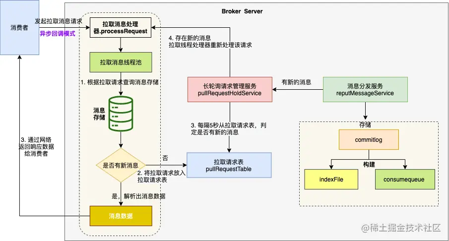 pullRequestQueue中弹出拉取消息,执行拉取任务 ,拉取请求是异步回调模式,将拉取到的消息放入到处理队列; - 拉取请求在一次拉取消息完成之后会复用,重新被放入拉取请求队列