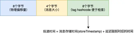 上图是 consumequeue 文件一条消息的格式,最后 8 个字节存储 Tag 的哈希值,此时存储消息的投递时间。