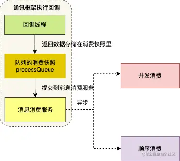 4、消费者的网络通讯层会执行拉取回调函数相关逻辑,首先会将消息数据存储在队列消费快照 processQueue 里;