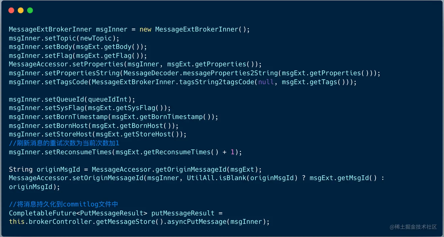 消息到期后,需要投递到目标 Topic 。第一步已经记录了原来的 Topic 和队列信息,这里需要重新设置,再存储到 commitlog 中。