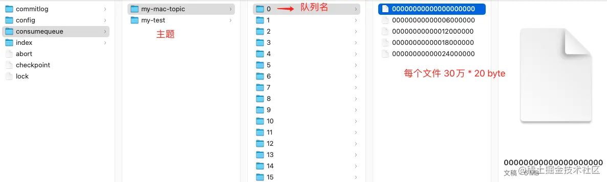 每个 consumequeue 文件包含 30 万个条目,每个条目大小是 20 个字节,每个文件的大小是 30 万 * 20 = 60万字节,每个文件大小约 5.72M 。