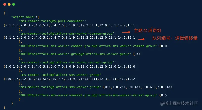 在进度文件 consumerOffset.json 里,数据以 key-value 的结构存储,key 表示:主题@消费者组 , value 是 consumequeue 中每个队列对应的逻辑偏移量 。