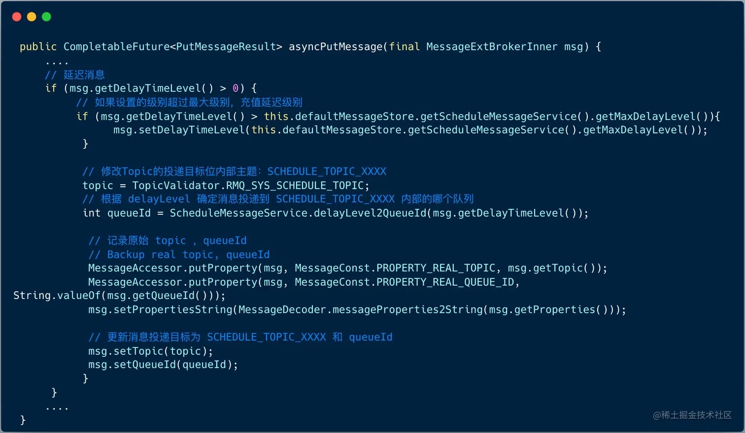 但由于消息一旦存储到 consumequeue 中,消费者就能消费到,而延迟消息不能被立即消费,所以 RocketMQ 将 Topic 的名称修改为SCHEDULE_TOPIC_XXXX,并根据延迟级别确定要投递到哪个队列下。