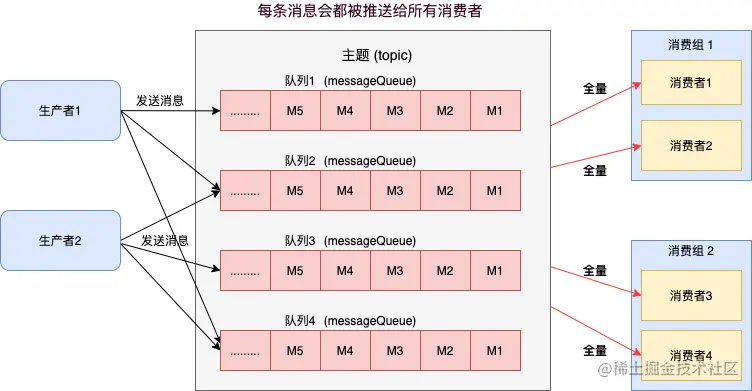 广播消费:当使用广播消费模式时,每条消息推送给集群内所有的消费者,保证消息至少被每个消费者消费一次。