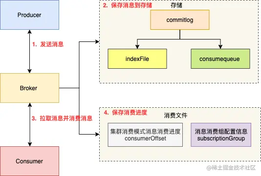4、保存进度:消费者将消费进度提交到 Broker ,Broker 会将该消费组的消费进度存储在进度文件里。