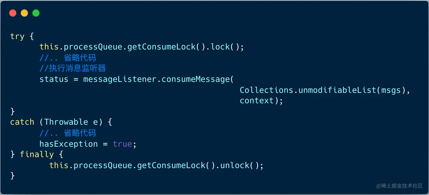 消费快照的消费锁 consumeLock 的作用是:防止负载均衡线程把当前消费的 MessageQueue 对象移除掉。