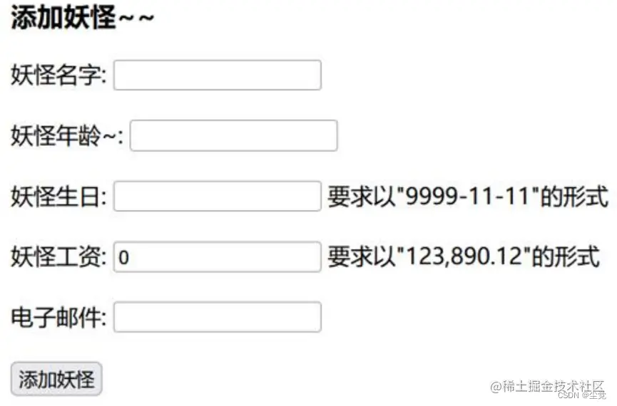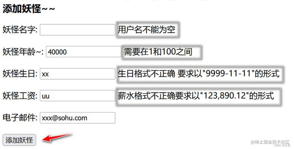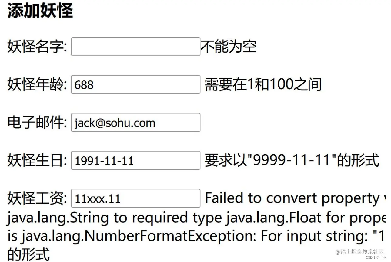 妖怪薪水: <form:input path="salary"/> <form:errors path="salary"/> 要求以"123,890.12"的形式<br><br>