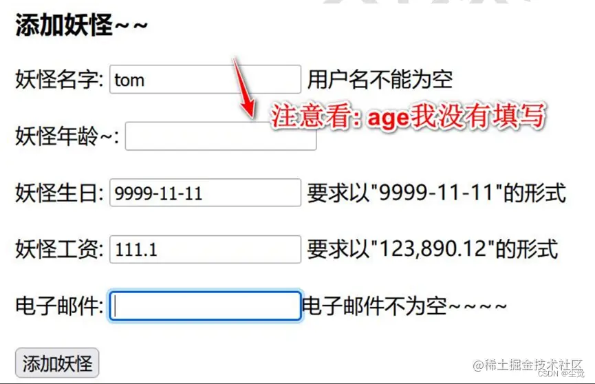 这时 age 不能为空,同时必须是 1-100, (也不能输入 haha, hello 等不 能转成数字的内容)