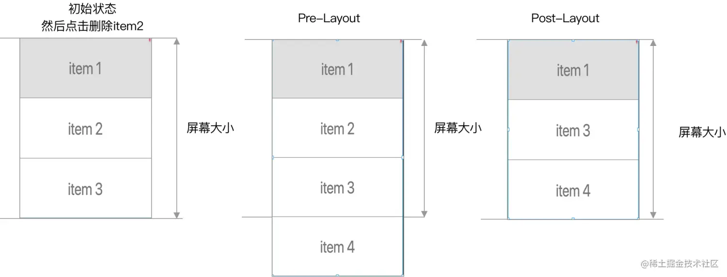 pre-layout) 如item1234然后再布局一次(post-layout) 形成另外一张快照item134这样我们其实就知道了整个动画轨迹 就可以生成动画