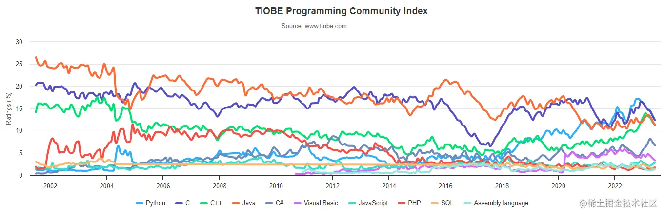 TOP 10 编程语言 TIOBE 指数走势(2002-2022)