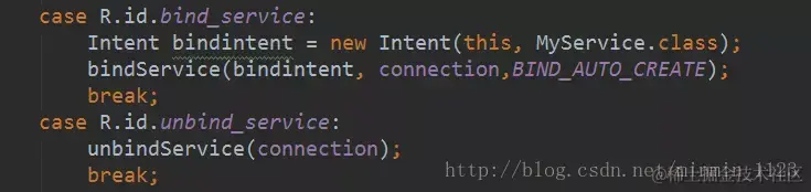 最后在在对应的场景(如某个View的回调方法中), 利用Intent对象以及下面两个方法 实现活动和服务的绑定和解绑: