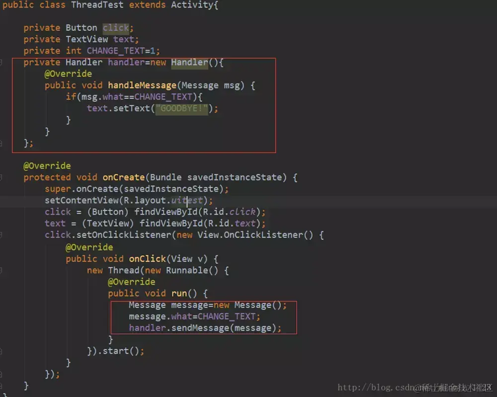 Thread、Runnable()、run()、start()等类与方开启子线程,在子线程的线程任务执行单位(即run())中: 3.1. 实例化Message对象; 3.2. 将任务常量id设置到Message实例对象的what字段中; 3.3. 使用2.中定义的Handler实例调用sendMessage()将Message实例发送到MQ; 至此完成;