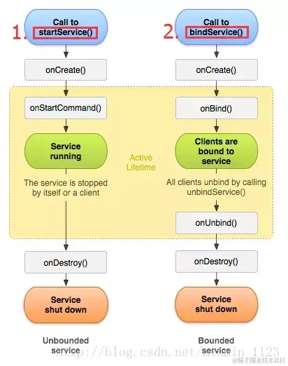 onBind()方法, 有选择的重写onCreate()、onStartCommand()及onDestroy()方法; -