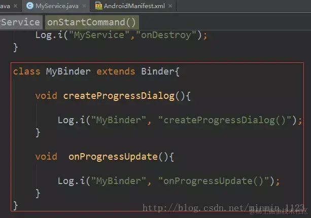 内部类(如MyBinder)继承Binder, 在其内部编写要放在Service后台服务执行的逻辑方法模块; -