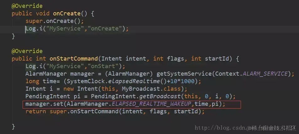 在onReceive()方法我们可以再次启动Service,
