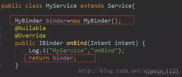 onBind()方法,返回成员变量MyBinder实例; -