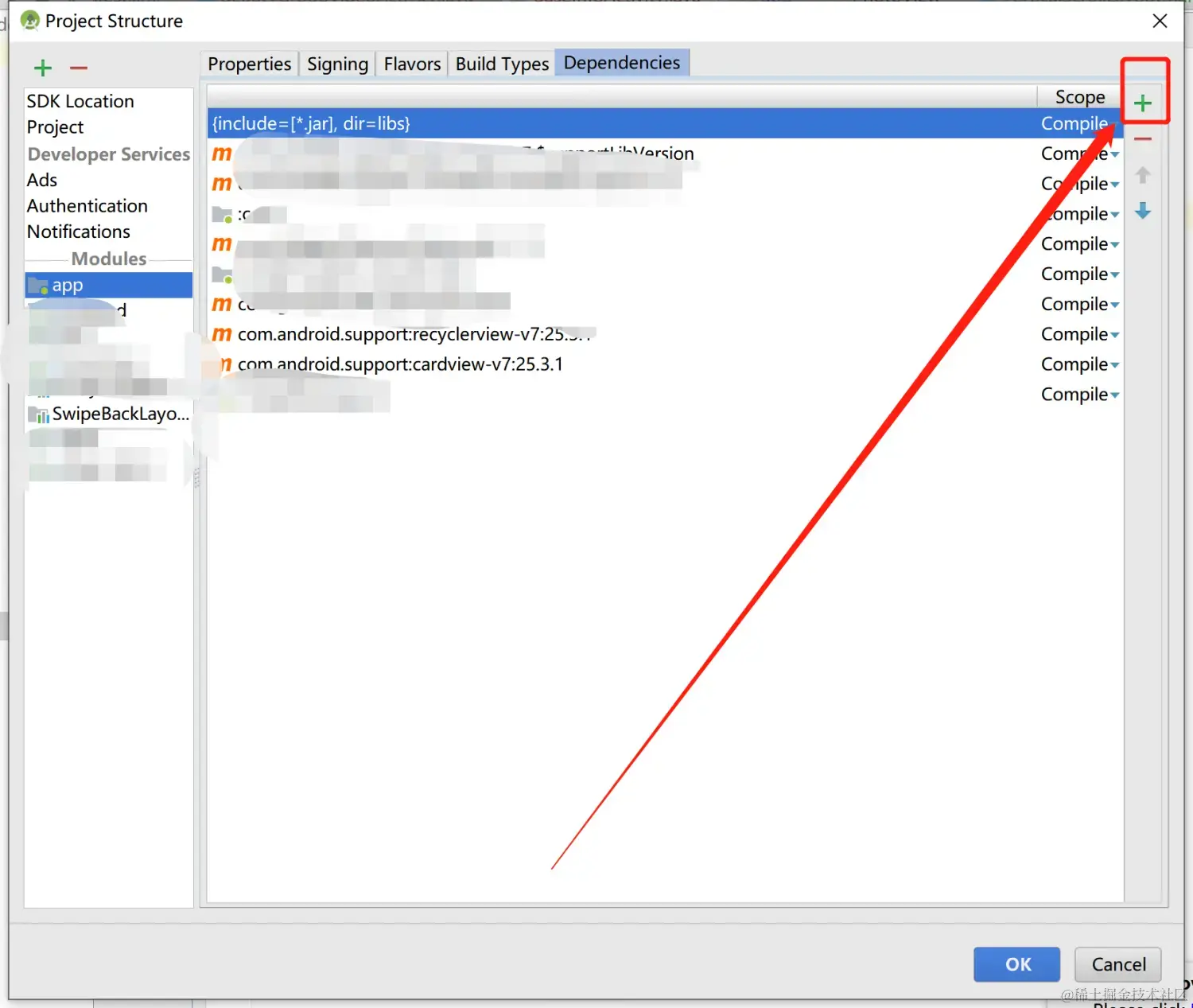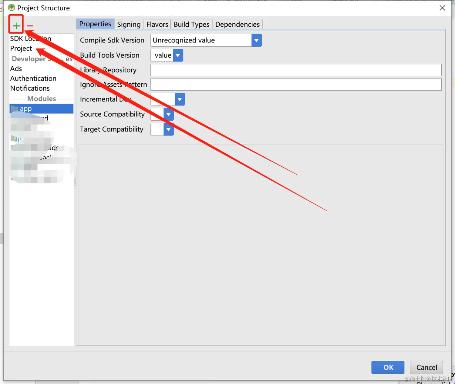 弹出如下窗口,左下角会显示已经成功引入的模块,现在我们点击左上角绿色加号: