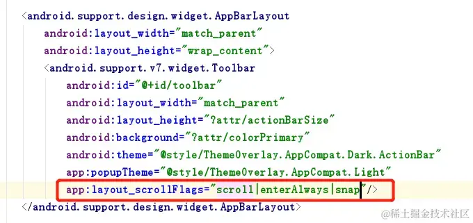 2.3 在Toolbar中添加一个app:layout_scrollFlags属性,并其值指定成了scroll|enterAlways|snap。