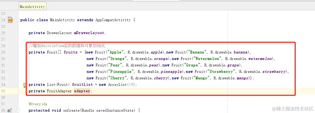 - 在MainActivity中定义了一个数组,数组存放多个Fruit的实例,每个实例代表一种水果;