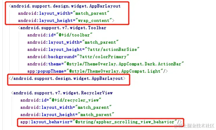 2.2 给RecyclerView指定一个布局行为(app:layout_behavior)——appbar_scrolling_view_behavior