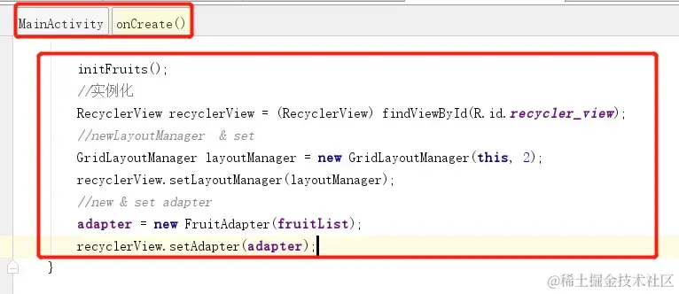 - 之后是RecyclerView的逻辑,这里使用GridLayoutManager布局方式。 GridLayoutManager的构造函数接收两个参数,第一个是Context,第二个是列数,这里指定为2,表示每一行中会有两列数据。