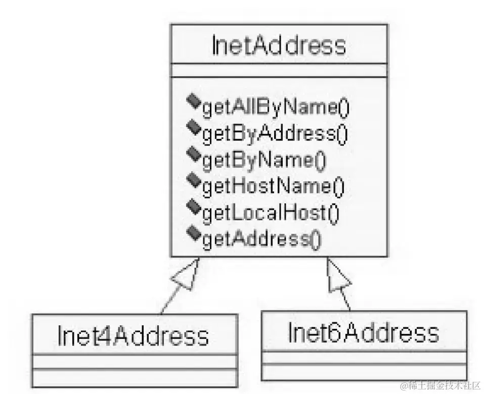 IP地址是给每个连接在Internet上的主机分配的一个32bit地址,java.net中处理IP地址的类是InetAddress, 其结构如图: -