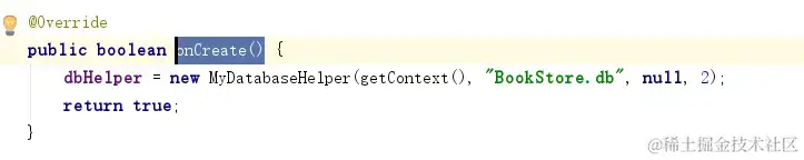 接下来是onCreate()方法: 创建了一个MyDatabaseHelper的实例,然后返回true表示内容提供器初始化成功,这时数据库就已经完成了创建或升级操作。