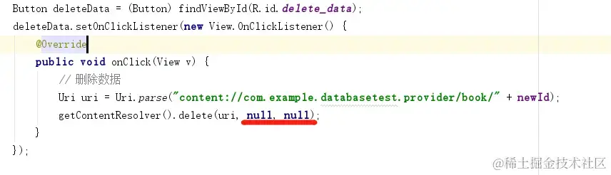 删除数据的时候, 解析一个以id结尾的内容URI, 调用ContentResolver的delete()方法执行删除操作就可以了, 由于我们在内容URI里指定了一个id,因此只会删掉拥有相应id的那行数据,不会影响Book表中的其他数据。
