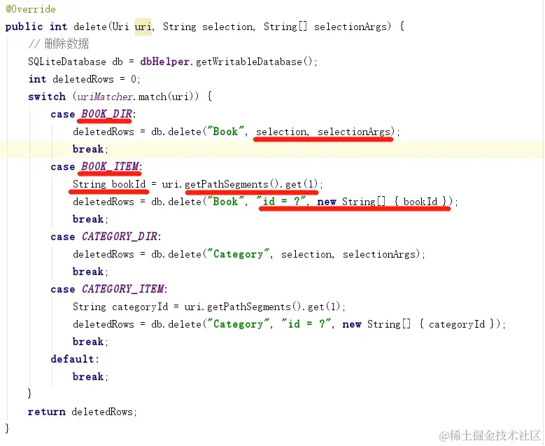 DIR类型常量匹配的,selection, selectionArgs参数位是由调用本内容提供器的时候由调用方程序提供的, 而ITEM则不同,uri中已经包含了ID,我们可以使用getPathSegments将之get出来再使用,即ITEM类型常量匹配的,调用方程序无需提供selection, selectionArgs参数位(如下方的代码截图),uri中已经包含了信息,处理方法也在内容提供器中写好了。 (这一点在调用getContentResolver().update()以及getContentResolver().delete()的时候都一样)
