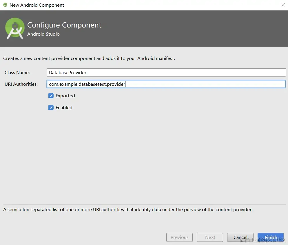 这里我们将内容提供器命名为DatabaseProvider, authority指定为com.example.databasetest.provider, Exported属性表示是否允许外部程序访问我们的内容提供器, Enabled属性表示是否启用这个内容提供器。 将两个属性都勾中,点击Finish完成创建。 接着我们修改DatabaseProvider:
