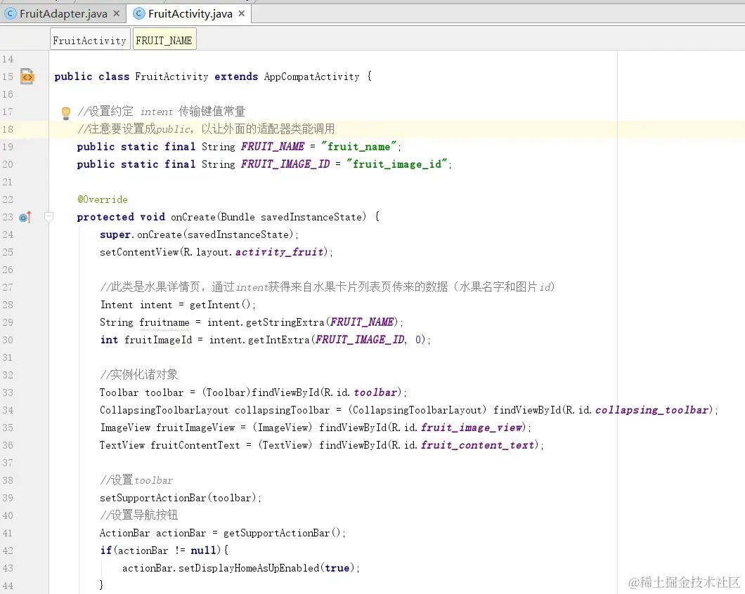 接下来处理RecyclerView的点击事件,将点击到的卡片子项提取出name和imageId, 用intent传给水果详情界面展示,下面修改FruitAdapter: