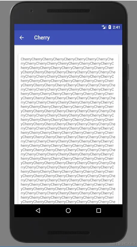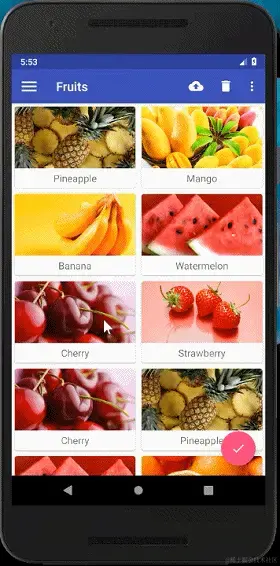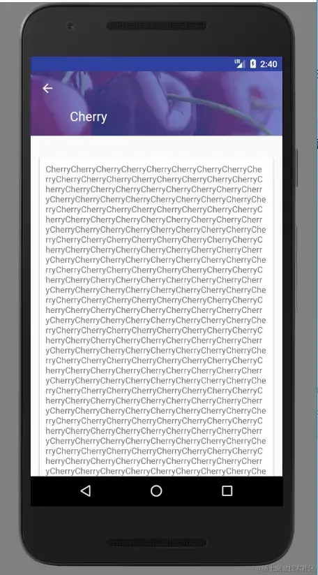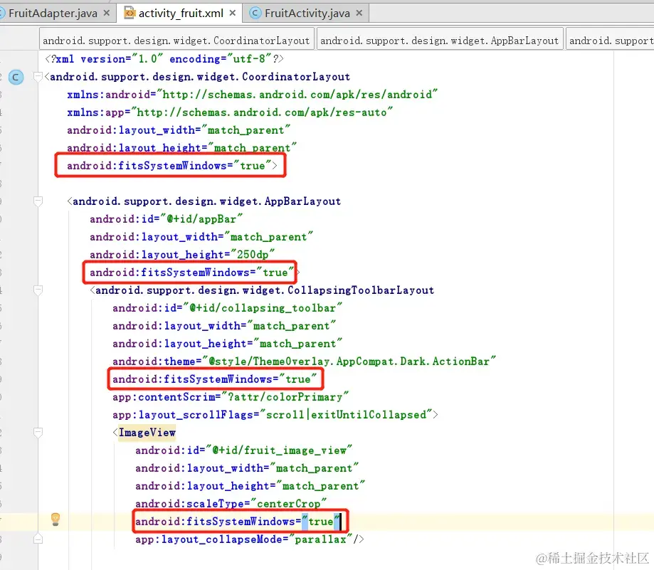 在 CoordinatorLayout(外层监听框架)、 AppBarLayout(水果详情界面标题栏外层)、 CollapsingToolbarLayout(水果详情界面标题栏)这种嵌套结构的布局中, 将控件的android:fitsSystemWindows属性指定成true,就表示该控件会出现在系统状态栏里。