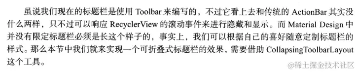 顾名思义,CollapsingToolbarLayout是一个作用于Toolbar基础之上的布局,由DesignSupport库提供。