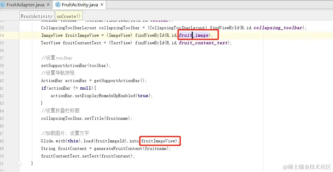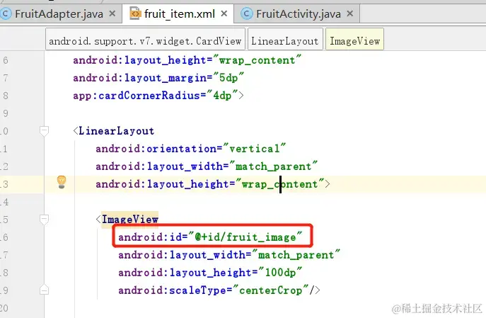 首先这个是水果详情界面标题栏的ImageView,id是fruit_image_view: