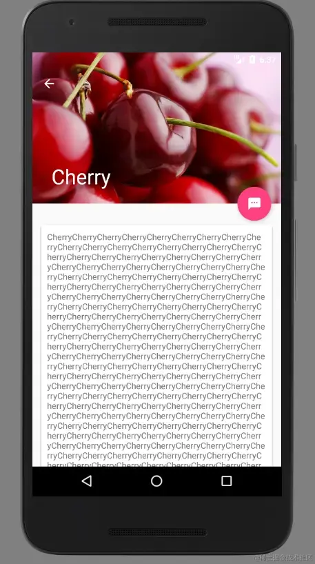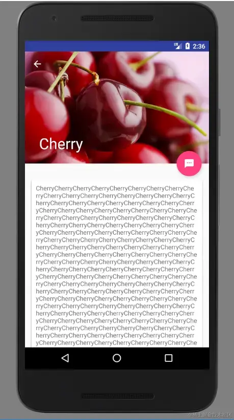 CoordinatorLayout下分三部分:水果标题栏、水果详情栏、悬浮按钮;