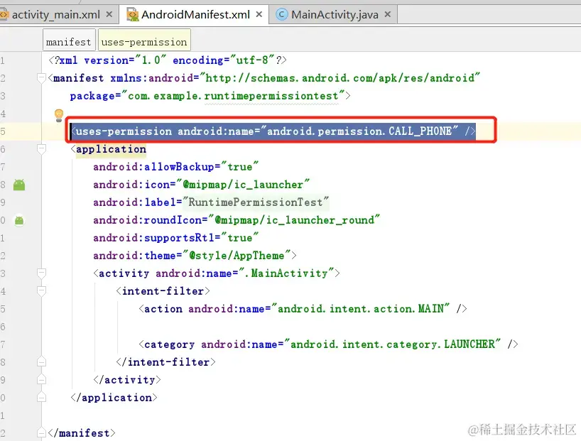 #####1.1 在程序运行时申请权限 首先新建一个RuntimePermissionTest项目; 本例子将尝试对CALL_PHONE这个权限的申请;